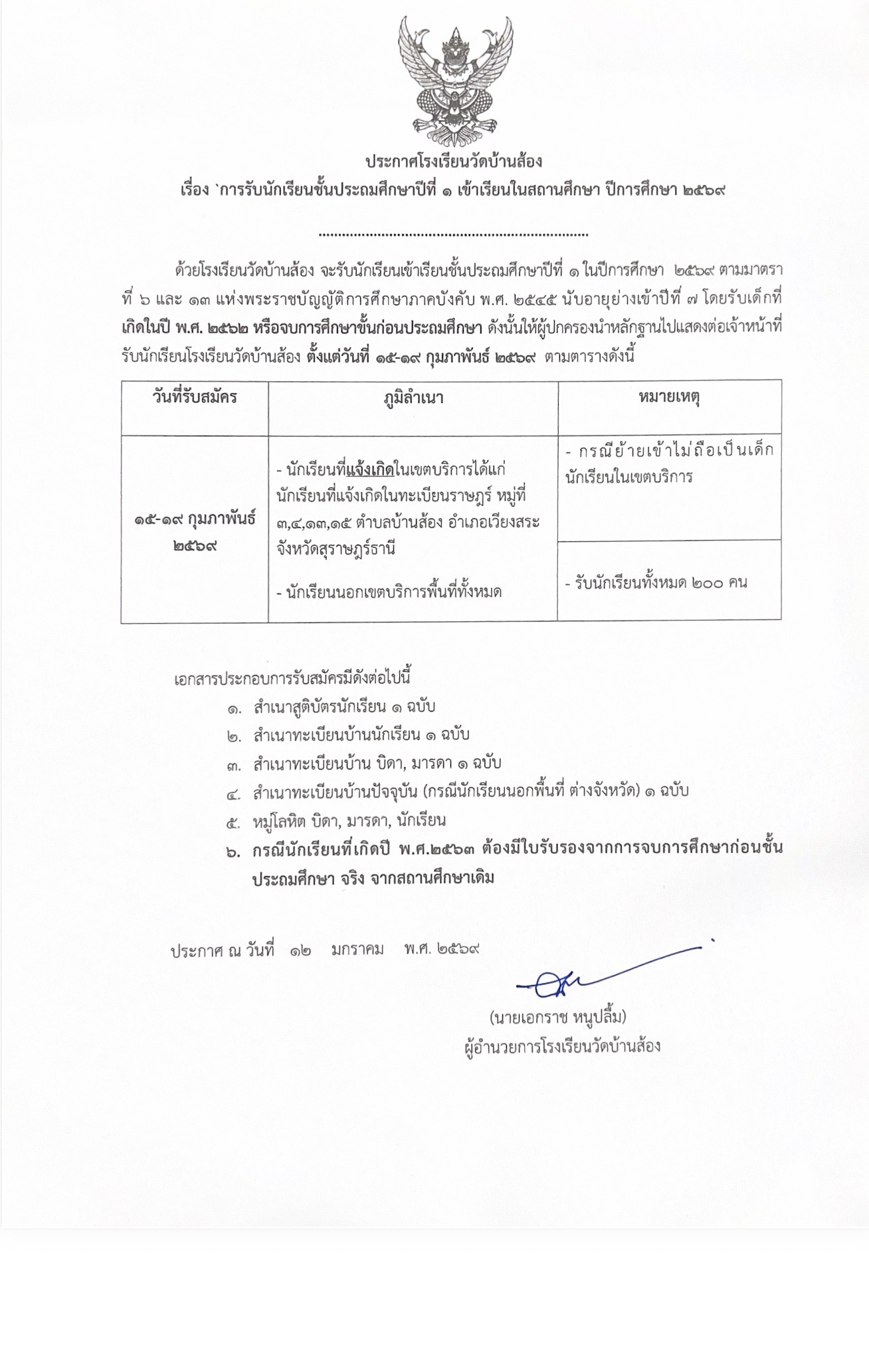 ประกาศโรงเรียนวัดบ้านส้อง เรื่อง การรับนักเรียนชั้นประถมศึกษาปีที่ 1 เข้าเรียนในสถานศึกษา ปีการศึกษา 2569
