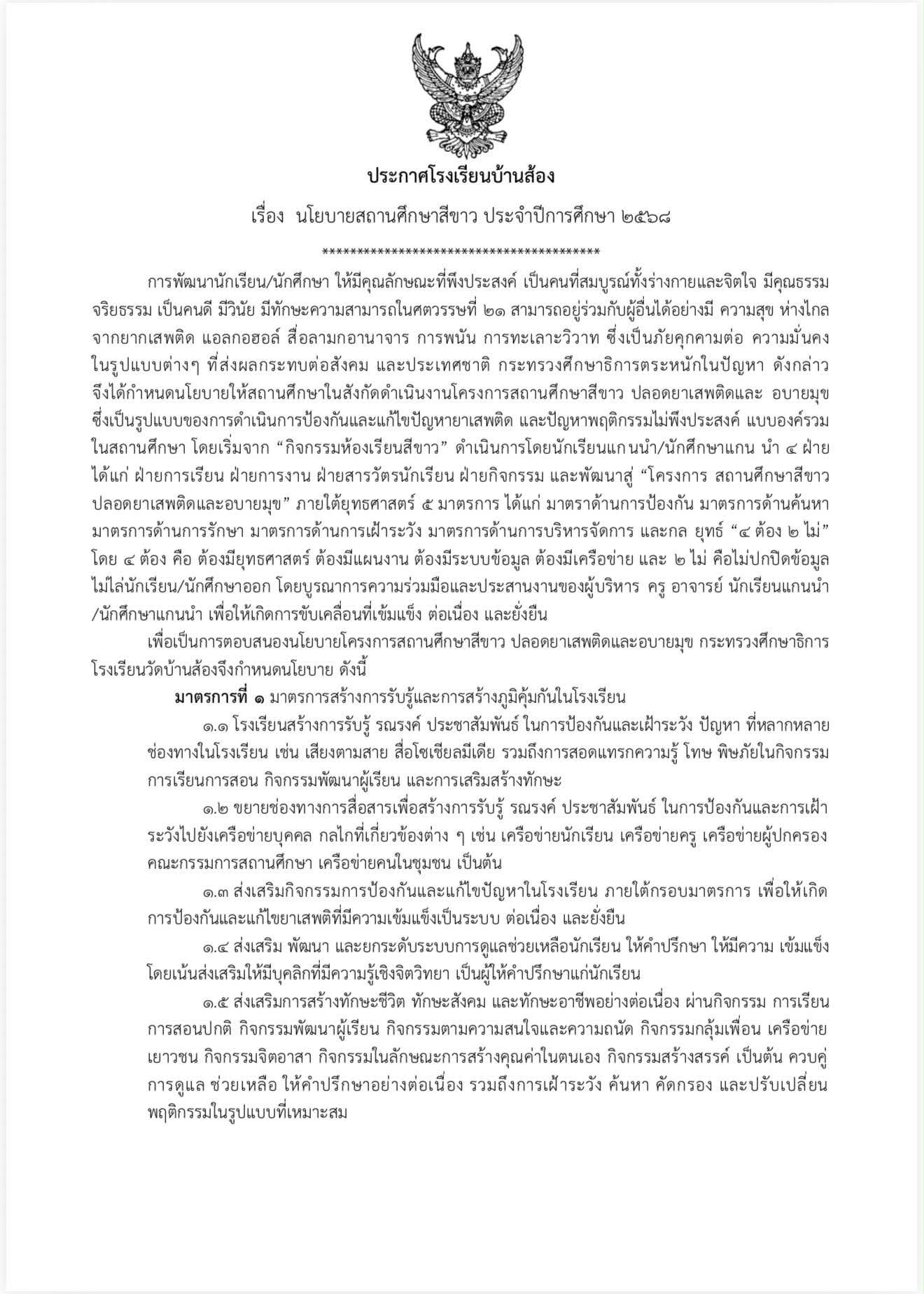 นโยบายสถานศึกษาสีขาว ประจำปีการศึกษา 2568